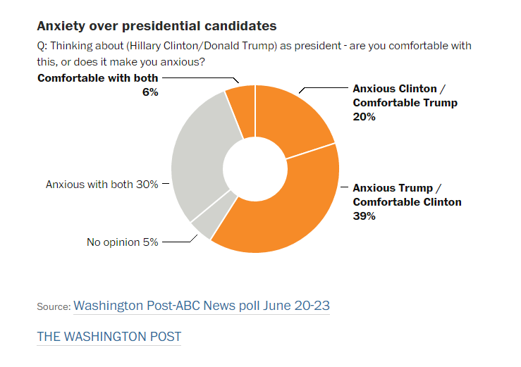 D’après ce sondage, 30% des américains sont anxieux à l’idée de voir Donald Trump ou Hillary Clinton accéder à la présidence. Ce chiffre grimpe même à 48% chez les électeurs âgés de moins de 30 ans ! 39% des américains se déclarent anxieux à l’idée de voir Trump accéder à la présidence, mais pas Clinton. 20% se déclarent anxieux à l’idée de voir Clinton accéder à la présidence, mais pas Trump.