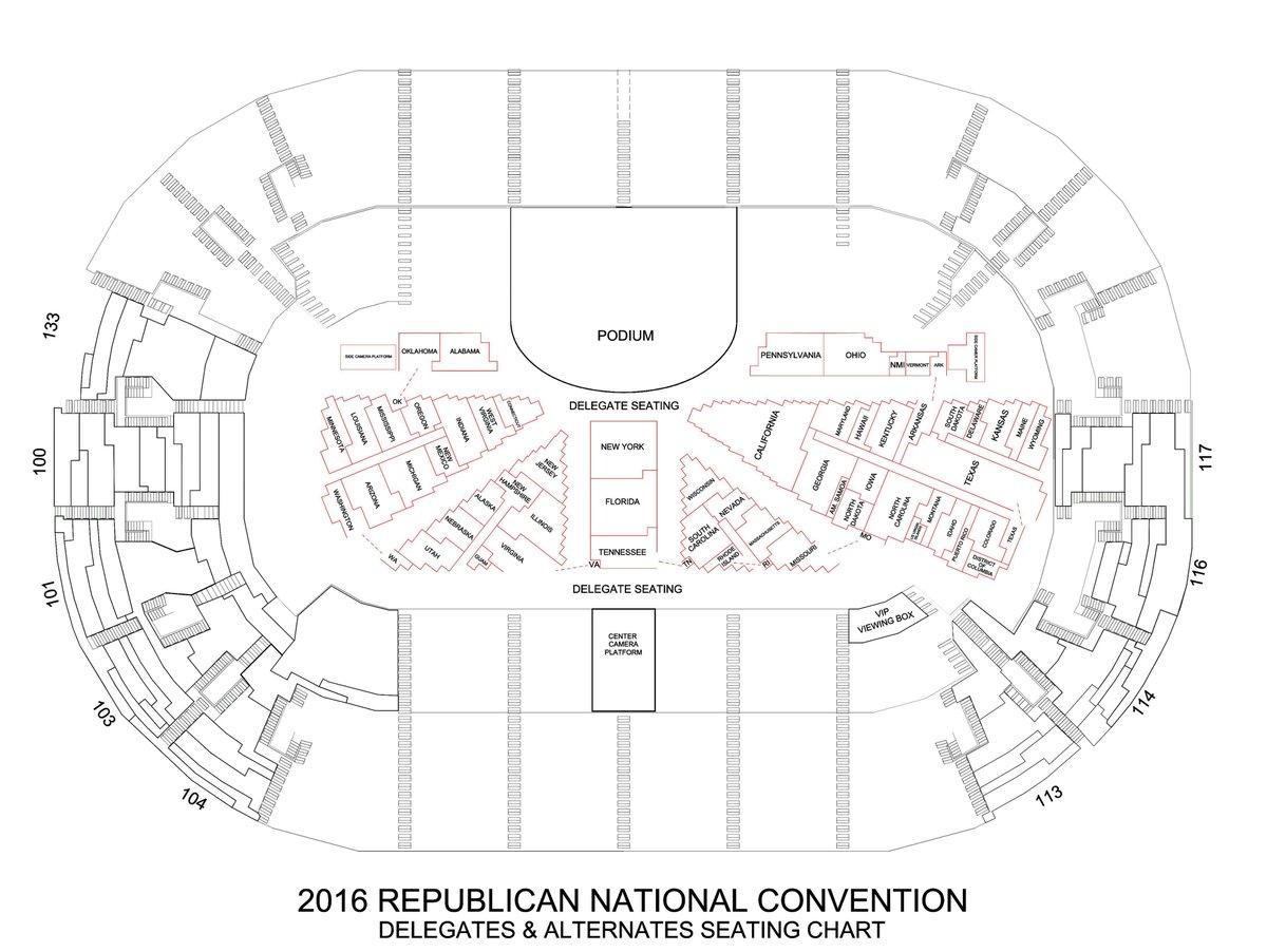 Revenons-en au déroulement de la Convention. Chaque état y envoie donc sa propre délégation. Le nombre de délégués par état varie en fonction de l’importance de celui-ci. Les délégations les plus importantes sont celles de la Californie (172 délégués) et du Texas (155 délégués). À l’inverse, les délégations du Delaware et du Vermont ne comptent que 16 délégués. Chaque délégation se voit attribuer une place précise dans la salle accueillant la Convention. Ci-dessous, la distribution des places au sein de la Quicken Loans Arena de Cleveland cette année.