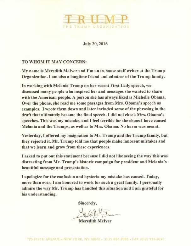 Après avoir nié toute forme de plagiat dans le discours de Melania Trump pendant plus de 24 heures, la campagne de Donald Trump effectue un virage à 180 degrés en publiant un communiqué reconnaissant finalement le plagiat ! Le communiqué est signé de la main d’une certaine Meredith McIver. Elle explique avoir travaillé avec Melania Trump pour préparer son discours et être la responsable du plagiat. Elle ajoute qu’elle a présenté sa démission à Donald Trump mais que celui-ci l’a refusée parce que « tout le monde fait parfois des erreurs ». Il est aussi amusant de lire dans ce communiqué que Melania Trump a toujours beaucoup aimé Michelle Obama (A person she has always liked is Michelle Obama).
