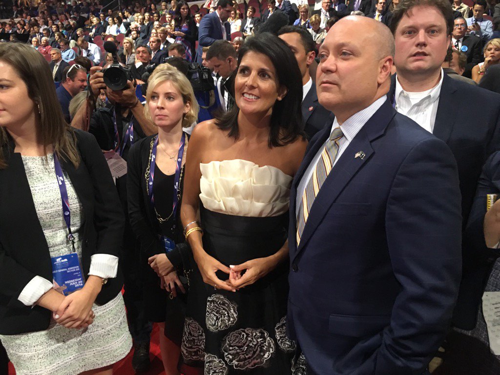Nikki Haley, gouverneure de Caroline du Sud, n’a pas prononcé de discours lors de la Convention mais elle était bien présente à Cleveland. Photographiée ici au milieu des délégués en compagnie de son mari.