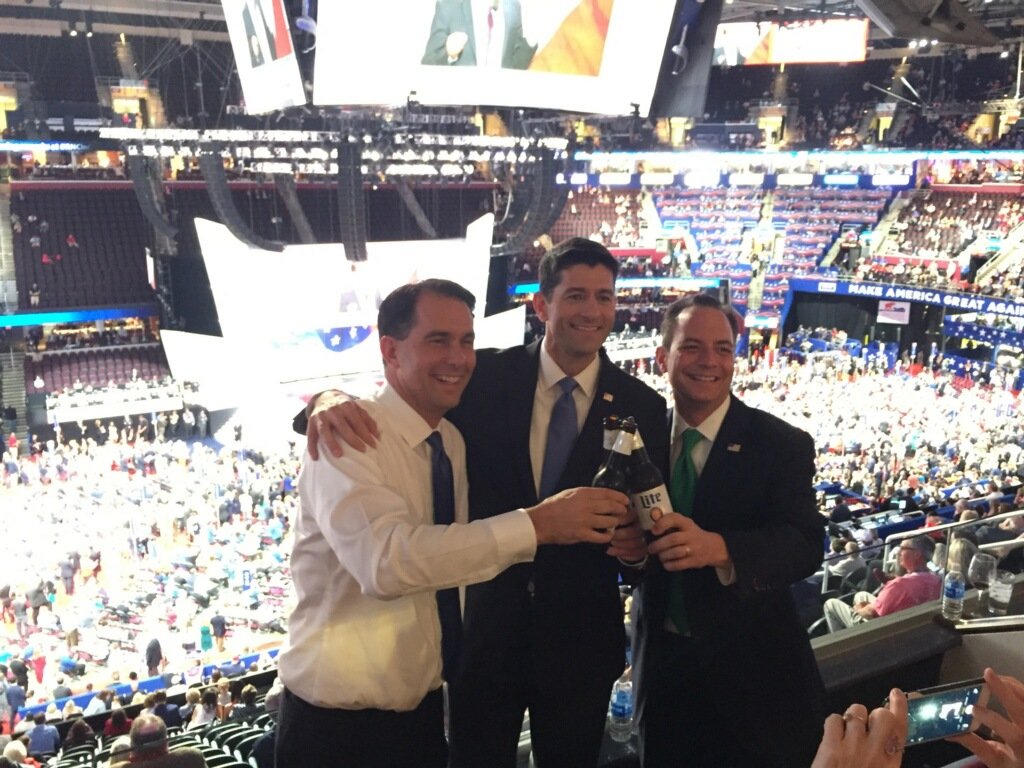 Ce cliché a été partagé par le gouverneur du Wisconsin Scott Walker sur son compte Twitter. On l’y voit en train de boire une bière en compagnie de Paul Ryan et Reince Priebus à l’intérieur de la Quicken Loans Arena. Cheers !