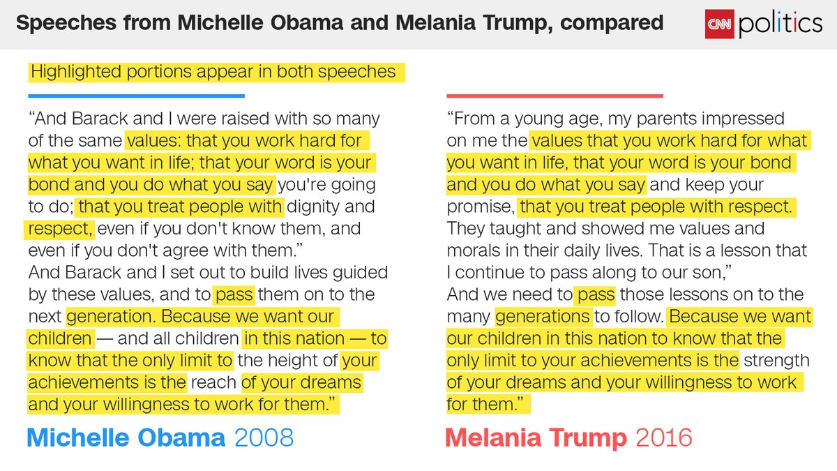 Oups ! Au lendemain de son discours, Melania Trump est accusée de plagiat. Une partie de son discours ressemblait en effet étrangement à celui qu’avait prononcé Michelle Obama à la Convention Démocrate de 2008. Jugez par vous-mêmes.