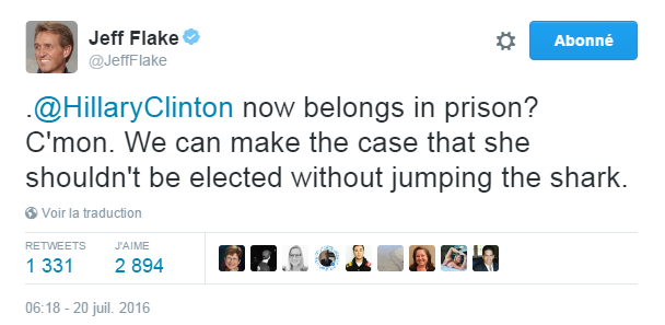 Le Parti Républicain avait choisi de donner la parole à la mère de l’une des victimes de l’attaque de Benghazi. Celle-ci déclarera qu’elle tient Hillary Clinton, qui était Secrétaire d’Etat à l’époque, pour responsable de la mort de son fils. Elle affirmera aussi que la candidate démocrate devrait se trouver en prison ! Et ce ne sera pas la seule à délivrer ce message. Tout au long de la Convention, on a pu régulièrement entendre des délégués chanter Lock her up! Lock her up! (Enfermez-la! Enfermez-la!) lorsque le nom d’Hillary Clinton était mentionné dans un discours. Réclamer l’incarcération du candidat du parti adverse? Du jamais vu. Et pas du goût de tout le monde. Voyez ce tweet du sénateur républicain Jeff Flake, qui n’assistait pas à la Convention et qui refuse pour l’instant d’apporter son soutien à Donald Trump.