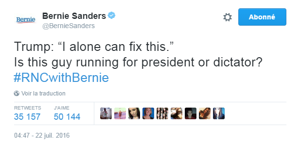 Ce tweet de Bernie Sanders fut, d’après Twitter, le plus partagé de la soirée sur le réseau social.