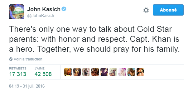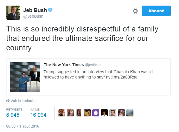 Les attaques de Donald Trump contre Khizr et Ghazala Khan ont évidemment suscité la réprobation. Ne pas s’en prendre aux parents de soldats morts au combat, même lorsqu’ils vous critiquent, est en effet l’une des règles d’or que les politiciens américains avaient toujours respectée jusqu’ici. Même au sein du camp républicain, les critiques ont fusé. Voyez par exemple ces tweets de Jeb Bush et John Kasich.