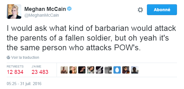 In recent days, Donald Trump disparaged a fallen soldier’s parents. He has suggested that the likes of their son should not be allowed in the United States – to say nothing of entering its service. I cannot emphasize enough how deeply I disagree with Mr. Trump’s statement. I hope Americans understand that the remarks do not represent the views of our Republican Party. (Ces derniers jours, Donald Trump a dénigré les parents d’un soldat mort au combat. Il a suggéré que les personnes semblables à leur fils ne devraient pas être admises aux Etats-Unis – et encore moins intégrer notre armée. Je ne peux pas suffisamment souligner à quel point je ne suis pas d’accord avec la position de Mr. Trump. J’espère que les américains comprennent que ses remarques ne représentent pas la vision de notre Parti Républicain)