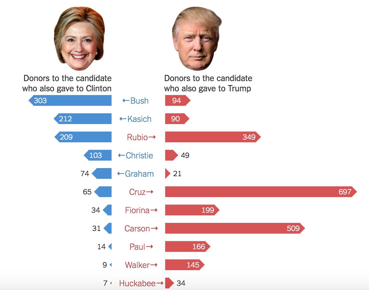 2. Cette infographie a été réalisée par le New York Times. On y voit vers quel candidat (Clinton ou Trump) se sont dirigées les personnes ayant fait des dons aux différents candidats républicains lors des primaires. Par exemple, 303 personnes ayant fait des dons à la campagne de Jeb Bush en ont également fait à celle de Clinton, alors qu’ils ne sont que 94 à avoir également fait un don à Donald Trump. On voit que parmi les donateurs de Bush, Kasich, Christie et Graham, ils ont été plus nombreux à se tourner vers Clinton que vers Trump ! Les donateurs des autres candidats ont été plus nombreux à se tourner vers Trump.