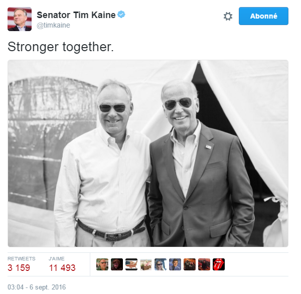 Nous devons le tweet de la semaine à Tim Kaine, colistier d’Hillary Clinton. Sous la mention Stronger Together (Plus forts ensemble, le slogan de campagne d’Hillary Clinton), une photo de Tim Kaine et du vice-président Joe Biden, qui a fait campagne pour la candidate démocrate cette semaine.