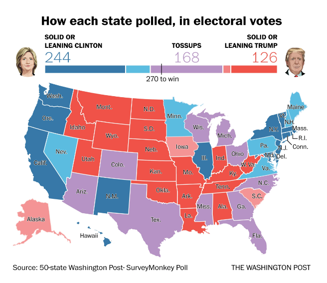 Voici la carte électorale des Etats-Unis à deux mois de l’élection présidentielle, d’après un sondage WashingtonPost/SurveyMonkey. Ou plus précisément, d’après cinquante sondages distincts, réalisés dans chacun des cinquante états.