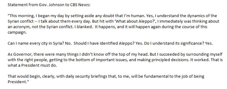Quelques heures plus tard, Johnson publiait un communiqué dans lequel il affirmait qu’en entendant le mot Aleppo, il avait immédiatement pensé à un acronyme et non au conflit syrien.