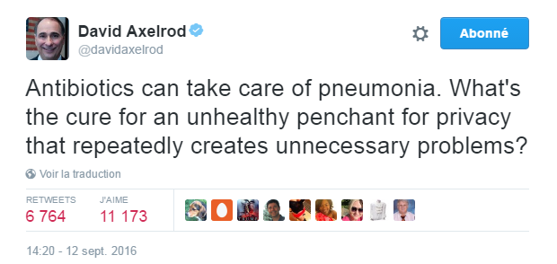Hillary Clinton souffre donc d’une pneumonie, ce qui explique son malaise survenu dimanche. Fin de l’histoire? Pas vraiment. Les rumeurs alarmistes qui circulaient sur le net vont certainement prendre encore plus d’ampleur dans les semaines à venir. Pour les adeptes de la théorie du complot, la pneumonie n’est évidemment qu’une excuse visant à dissimuler quelque chose de bien plus grave. Et force est de reconnaître qu’en attendant que les choses tournent mal pour révéler qu’elle souffrait d’une maladie pourtant diagnostiquée deux jours plus tôt, Hillary Clinton a sans doute facilité le travail des complotistes en tous genres. C’est d’ailleurs sur ce point que la presse traditionnelle s’interroge désormais. Pourquoi ne pas avoir dit tout de suite qu’elle souffrait d’une pneumonie? Aurait-on eu connaissance de ce diagnostic si la scène de son malaise n’avait pas été filmée par hasard par un homme qui passait par là? On peut raisonnablement penser que non. Alors pourquoi ce besoin de vouloir toujours dissimuler la vérité? C’est sur ce manque de transparence que la presse s’interroge désormais, davantage que sur l’état de santé de Clinton en tant que tel. C’est aussi le sens de ce tweet de David Axelrod, ancien conseiller de Barack Obama.