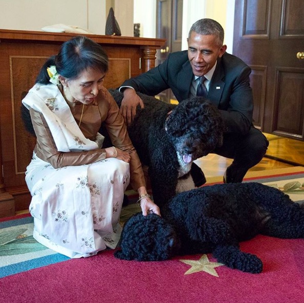 Barack Obama a reçu Aung San Suu Kyi à la Maison Blanche. On les voit ici en compagnie des deux chiens de la famille Obama, Bo et Sunny (photo Maison Blanche).
