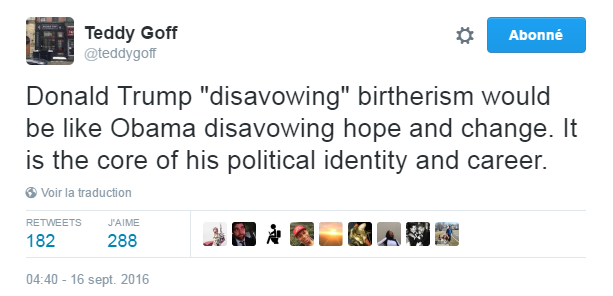 Est-il possible que les électeurs oublient si facilement les propos tenus par Donald Trump pendant cinq ans? Faut-il croire à son tout récent rejet du birtherism? Non, d’après Teddy Goff, ancien membre de l’équipe de campagne de Barack Obama et aujourd’hui membre de celle d’Hillary Clinton. D’après lui, le birtherism est étroitement lié à l’identité politique de Donald Trump. C’est en défendant cette thèse qu’il s’est fait une place sur la scène politique. Trump et birtherism sont donc indissociables.