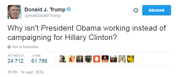 1. Ce tweet publié par Donald Trump après que Barack Obama ait prononcé un discours de campagne au nom d’Hillary Clinton à Philadelphie.