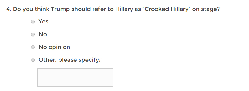 Donald Trump a l’art de donner des surnoms peu flatteurs à ses adversaires. Souvenez-vous de Low-energy Jeb pour Jeb Bush, Little Marco pour Marco Rubio ou encore Lyin’ Ted pour Ted Cruz. Le surnom qu’il a attribué à Hillary Clinton est tout aussi dévastateur: Crooked Hillary (Hillary la malhonnête). La question était de savoir s’il utiliserait ce surnom pour désigner son adversaire lors du débat, comme il le fait régulièrement lors de ses meetings. C’était d’ailleurs l’objet de l’une des questions du sondage auquel le candidat républicain avait invité ses sympathisants à participer sur son site web afin de l’aider à se préparer au débat. Pensez-vous que Trump devrait faire référence à Hillary comme « Hillary la malhonnête » pendant le débat?