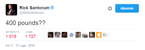 Un individu de 400 pounds, ce qui équivaut tout de même à 181 kilos (!), assis sur son lit? On ne sait pas pourquoi Donald Trump a songé à une telle référence mais cela en a en tout cas surpris plus d’un, même parmi ses supporters. Voyez ce tweet publié par Rick Santorum, ancien candidat à la présidence qui soutient aujourd’hui Trump.