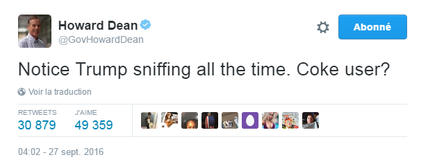 Il y avait les théories extravagantes sur la santé d’Hillary Clinton. Désormais, il y aura aussi la rumeur Donald Trump cocaïnomane. Donald Trump a en effet reniflé à plus de trente reprises lors du débat, ce qui n’a échappé à personne. Sans doute était-il tout simplement enrhumé. Ou peut-être est-ce un tic lorsqu’il est stressé? C’est en tout cas ce qu’une journaliste qui a assisté à bon nombre de ses meetings a laissé entendre, expliquant que ce n’était pas la première fois qu’elle le voyait renifler de la sorte. Certains internautes ont une autre explication. Donald Trump aurait pris de la cocaïne avant le débat. Une théorie reprise par Howard Dean, ex-gouverneur du Vermont.
