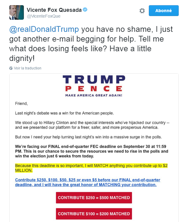 1. L’ex-président mexicain Vicente Fox, qui a souvent critiqué Donald Trump, semble recevoir régulièrement des e-mails l’incitant à contribuer financièrement à la campagne du candidat républicain. Et cela ne lui plaît pas du tout. Dans ce tweet, il s’adresse directement à Donald Trump.