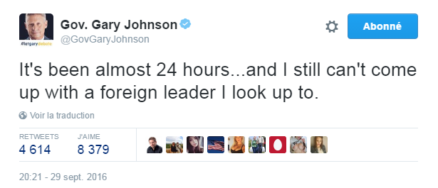 Puisque l’on parle de Gary Johnson, sachez qu’il a été l’auteur d’une nouvelle bourde cette semaine. Vous vous souvenez certainement de cette interview lors de laquelle il avait demandé « Qu’est-ce qu’Alep? » alors qu’on lui posait une question sur la ville syrienne. Cette fois-ci, il participait à une émission en compagnie de son colistier Bill Weld. Le présentateur lui a demandé de donner le nom d’un leader étranger qu’il respectait et admirait. Et Johnson a été incapable de répondre. Il a finalement parlé de l’ « ancien président du Mexique », sans parvenir à se souvenir de son nom.