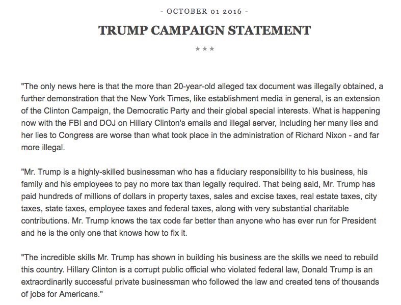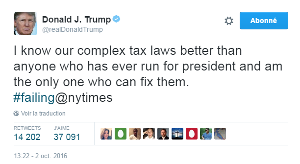 Dans un communiqué officiel, Donald Trump a également accusé le New York Times de faire campagne pour Hillary Clinton, comme l’ensemble des médias. Il affirme aussi qu’il est de sa responsabilité, envers sa famille et ses entreprises, de ne pas payer plus d’impôts que ce qui est « légalement obligatoire ».
