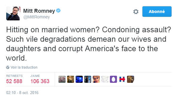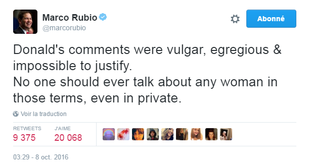 I have a wife, I have a daughter, I have a mother, and I have five sisters […] If anyone spoke to my wife, or my daughters, or my mother, or any of my five sisters the way Mr. Trump has spoken to women, I wouldn’t hire that person, I wouldn’t want to be associated with that person. And I certainly don’t think I’d feel comfortable hiring that person to be the leader of the free world. (J’ai une femme, j’ai une fille, j’ai une mère, et j’ai cinq sœurs […] Si quelqu’un parlait à ma femme, ou à mes filles, ou à ma mère, ou à l’une de mes cinq sœurs comme Mr. Trump a parlé à certaines femmes, je n’embaucherais pas cette personne, je ne voudrais pas être associé à cette personne. Et je ne pense certainement pas que je serais à l’aise à l’idée de recruter cette personne pour être le leader du monde libre)