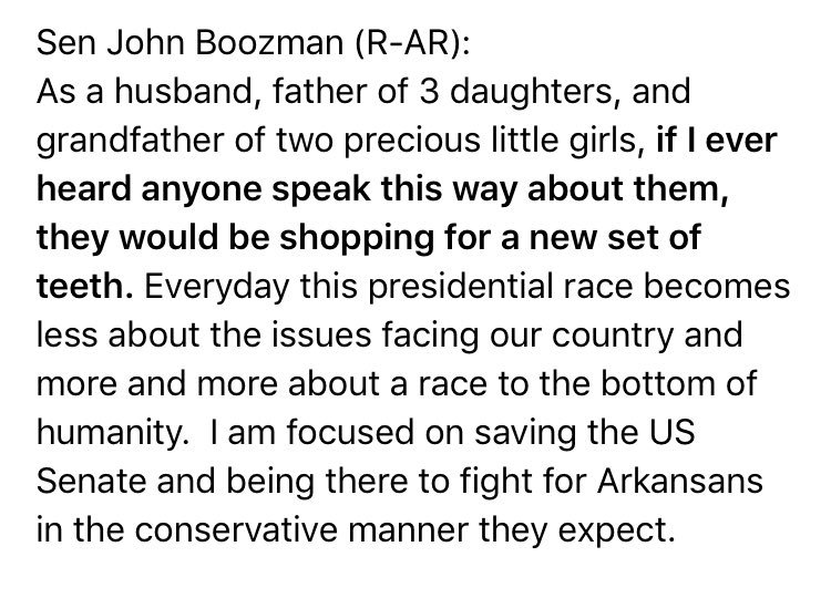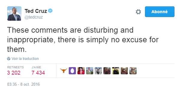 First of all, I don’t know that he did it to anyone. This is talk, and gosh almighty, he who hasn’t sinned throw the first stone here. […] The fact is that men at times talk like that. Not all men, but men do. He was wrong for doing it. I am not justifying it. I believe it’s wrong. I know he believes it’s wrong. I believe this is not the man we’re talking about today. (Tout d’abord, je ne sais pas s’il a fait cela à qui que ce soit. Ce sont des paroles, et mon Dieu, que celui qui n’a jamais pêché lui jette la première pierre. […] Les hommes parlent parfois ainsi. Pas tous les hommes, mais certains le font. Il a eu tort de le faire. Je ne le justifie pas. Je crois que c’est mal. Je sais qu’il croit que c’est mal. Je crois que ce n’est plus l’homme dont nous parlons aujourd’hui)