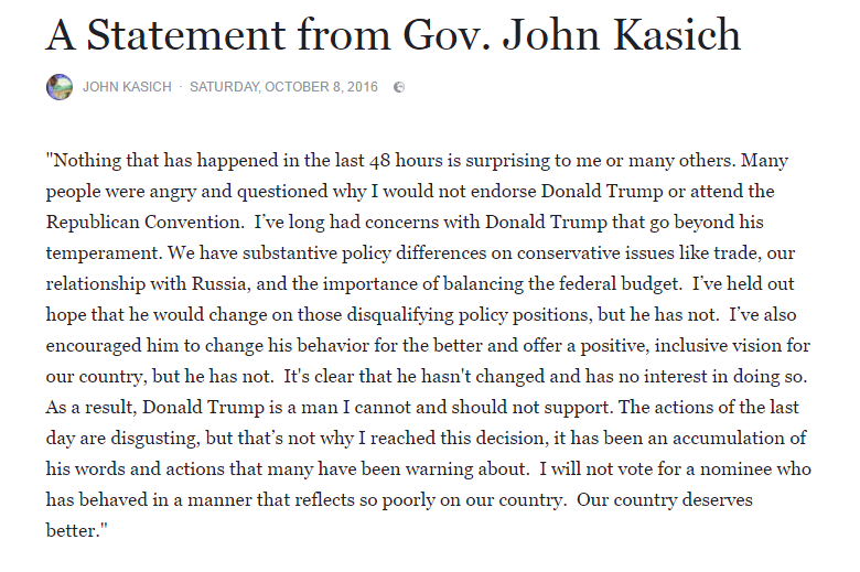 On se doutait déjà que John Kasich ne voterait pas pour Donald Trump. Il ne l’a jamais soutenu et ne s’est pas rendu à la Convention Républicaine à Cleveland. Il y a quelques semaines, il déclarait déjà au micro de CNN qu’il était « très peu probable » qu’il vote pour Trump au mois de novembre. C’est désormais sûr à 100%. John Kasich explique que les dernières révélations ne le surprennent pas et qu’il n’a pas pris sa décision uniquement en raison de la nouvelle vidéo, mais d’une « accumulation de déclarations et d’actions ».