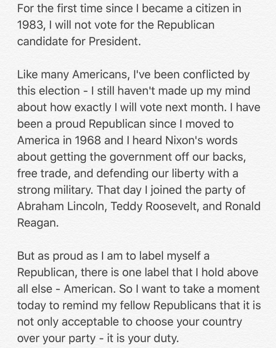 Resté jusque-là très discret depuis le début de la campagne (sauf lorsqu’il avait annoncé soutenir John Kasich lors des primaires), Arnold Schwarzenegger a indiqué qu’il ne voterait pas pour Donald Trump. Il a aussi incité tous ses collègues républicains à placer comme lui l’intérêt de leur pays avant celui de leur parti. Voici le texte qu’il a publié sur son compte Twitter.