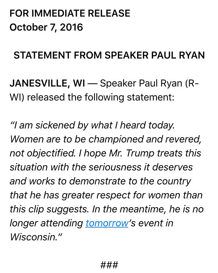 Paul Ryan, le speaker de la Chambre des Représentants, a lui aussi réagi très rapidement. Dans un communiqué, il s’est dit « écœuré » et a annoncé que Donald Trump ne l’accompagnerait pas dans le Wisconsin le lendemain. Les deux hommes devaient en principe se rendre à un meeting organisé par le Parti Républicain et faire ainsi campagne ensemble pour la toute première fois !