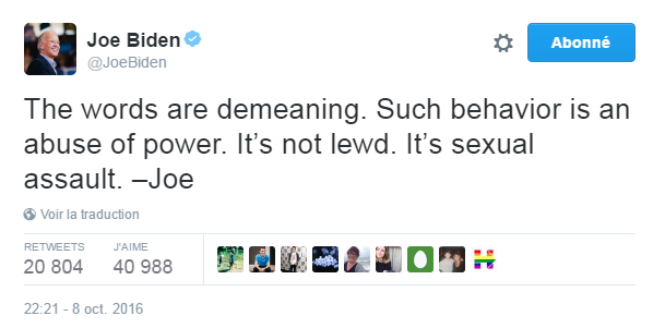 Les propos vulgaires de Trump ont choqué, certains considérant même qu’ils correspondent à la description d’agressions sexuelles. C’est le cas du vice-président américain Joe Biden.