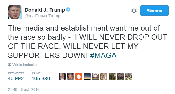 Face à toutes ces condamnations et défections, comment Donald Trump a-t-il réagi? Il a déclaré à la presse qu’il n’avait nullement l’intention de se retirer de la course comme certains le lui demandent. Il a également pris un bain de foule devant la Trump Tower où des supporters s’étaient rassemblés pour le soutenir. Et il a évidemment tweeté.