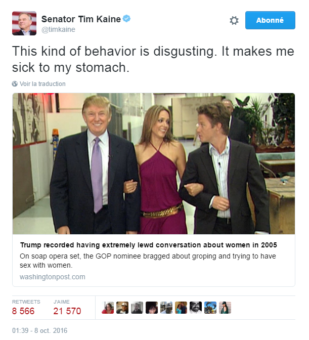 Le colistier de Clinton, Tim Kaine, a quant à lui déclaré que la vidéo le rendait malade.