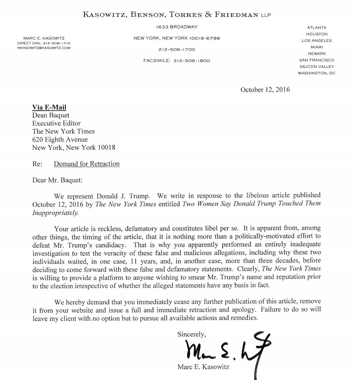 Bien que le New York Times ait répondu qu’il ne céderait pas à de telles menaces et bien que l’article soit toujours accessible, aucune plainte concrète n’a encore été déposée. Quant à Natasha Stoynoff, Donald Trump a affirmé lors d’un meeting qu’elle avait tout inventé, suggérant maladroitement qu’elle n’était de toute façon pas assez jolie pour qu’il tente quoi que ce soit avec elle.