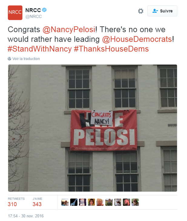 Nancy Pelosi est députée à la Chambre des Représentants depuis 1987. Depuis 2003, elle est la leader des Démocrates dans cette même assemblée. Elle a été réélue cette semaine à ce poste par ses collègues, malgré la campagne assez agressive de son opposant, le jeune député de l’Ohio Tim Ryan. Celui-ci estimait qu’il était temps de faire place à un nouveau leadership après les derniers résultats électoraux catastrophiques du parti. Il a obtenu 63 voix, contre 134 en faveur de Pelosi.