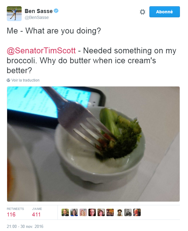 2. Ceci est une information totalement inutile. Le sénateur Ben Sasse a révélé que son collègue Tim Scott mangeait ses brocolis avec de la crème glacée.