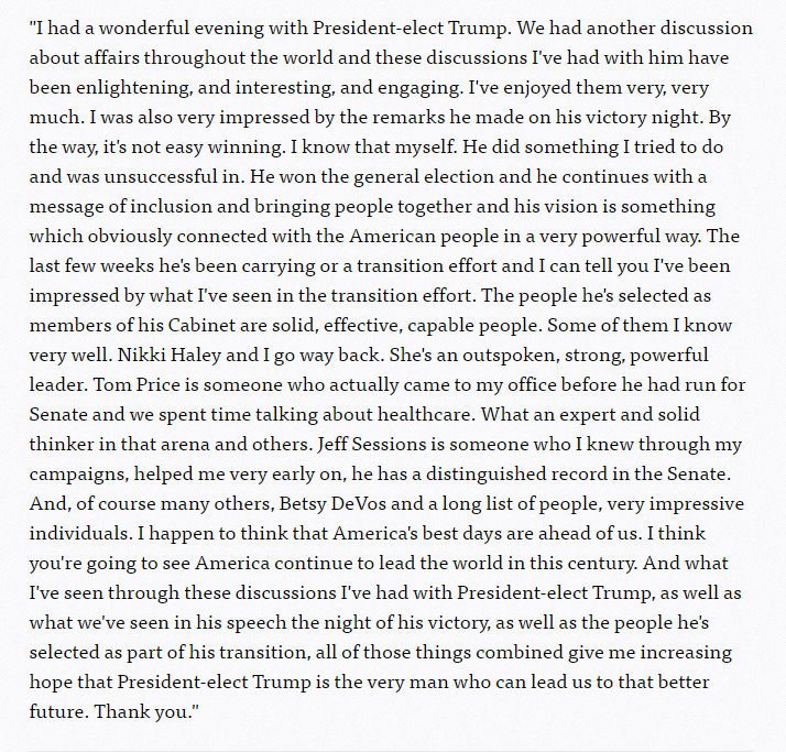 C’est décidément LE feuilleton de cette transition. Qui sera donc Secrétaire d’Etat? Nous vous parlions la semaine dernière de la lutte à distance entre Mitt Romney et Rudy Giuliani, qui font partie des favoris. Cette semaine, Mitt Romney a dîné avec Donald Trump dans un restaurant huppé de New York, le Jean Georges (3 étoiles au Guide Michelin). Il s’agissait de leur deuxième rencontre depuis l’élection de Trump. Ils étaient accompagnés de Reince Priebus, patron du Parti Républicain et futur chief of staff de la Maison Blanche. Les trois hommes ont commandé une soupe à l’ail et des cuisses de grenouille en entrée. En guise de plat, Trump et Priebus ont opté pour un steak sirloin avec des carottes, alors que Mitt Romney a choisi des côtes d’agneau avec une sauce aux champignons. Pour le dessert, les trois hommes ont mangé du gâteau au chocolat. Après le dîner, Mitt Romney s’est brièvement exprimé face à la presse, avant tout pour complimenter Donald Trump. Ce qui est assez surprenant lorsque l’on se souvient de ce qu’il disait il y a encore quelques mois. Voici l’entièreté de la déclaration de Romney :