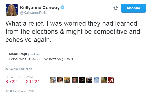 Kellyanne Conway, l’ex-directrice de campagne et aujourd’hui proche conseillère de Donald Trump, a elle aussi réagi avec ironie sur Twitter.