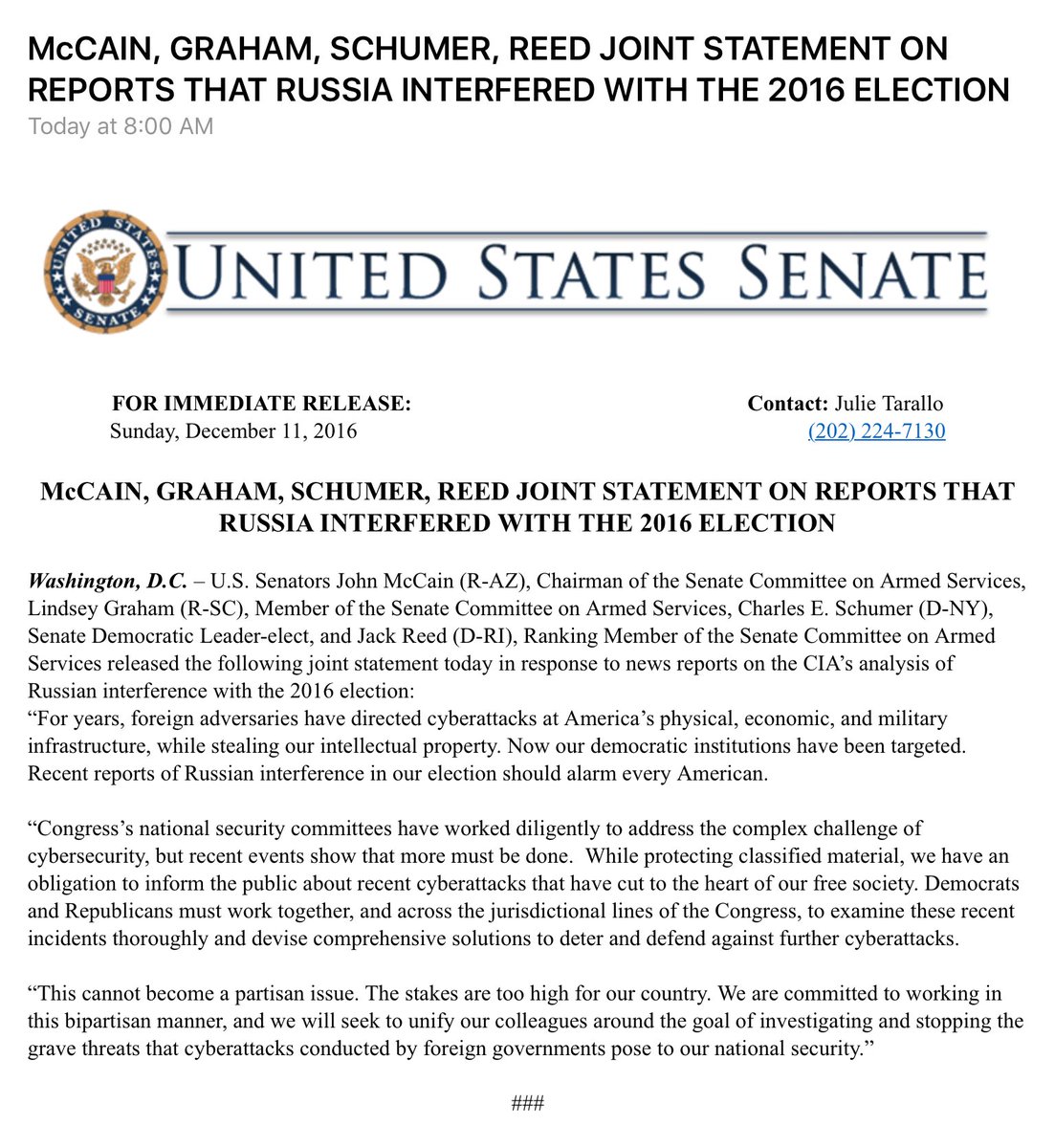 Certains sénateurs réclament désormais qu’une commission d’enquête soit mise sur pied pour faire éclater toute la vérité sur les actions de la Russie. Les sénateurs John McCain (R), Lindsey Graham (R), Chuck Schumer (D) et Jack Reed (D) ont publié un communiqué commun allant dans ce sens.