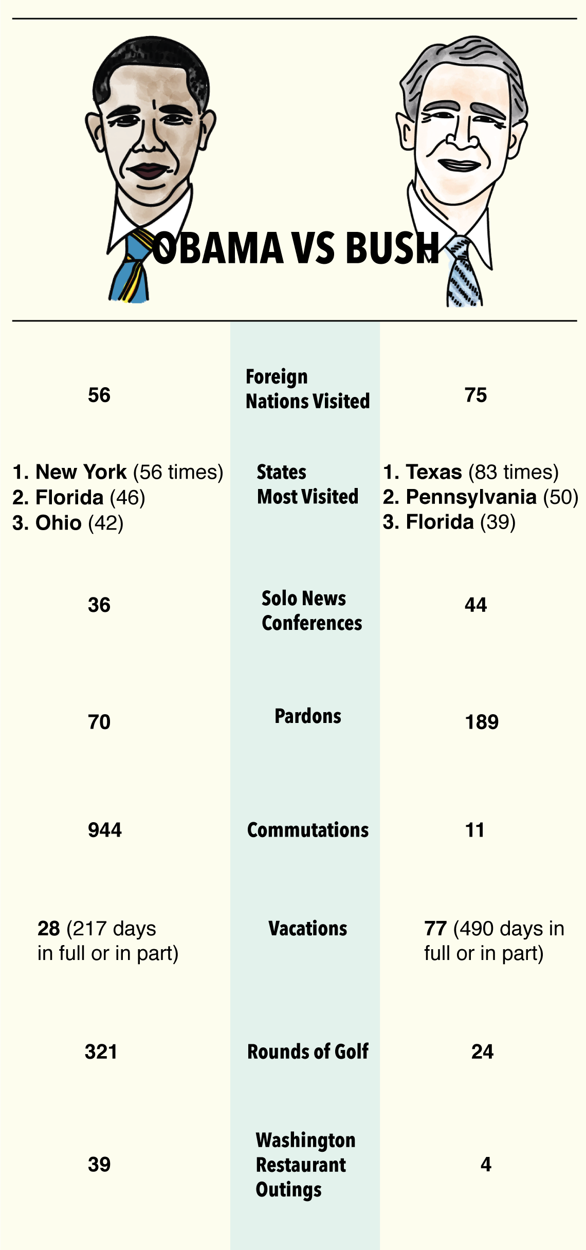 Le Washingtonian a comparé les présidences de Barack Obama et de son prédécesseur, George W. Bush. Ce dernier a visité plus de pays pendant sa présidence (75) qu’Obama (56) et a donné plus de conférences de presse (44 contre 36). Il s’est aussi accordé plus de jours de congé (490 contre 217).
