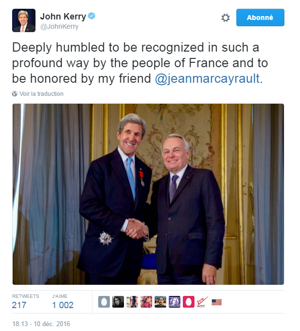 John Kerry, en visite à Paris, a reçu la Légion d’Honneur. C’est Jean-Marc Ayrault, le ministre français des affaires étrangères, qui la lui a remise, le qualifiant de « plus français des responsables américains » et d’ « inlassable partisan de la paix ».