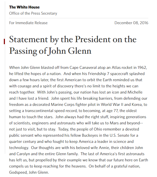 De très nombreuses personnalités politiques américaines ont rendu hommage à John Glenn et les drapeaux du Capitole ont été mis en berne. Voici le communiqué officiel de Barack Obama, qui parle de la perte d’une « icône ».