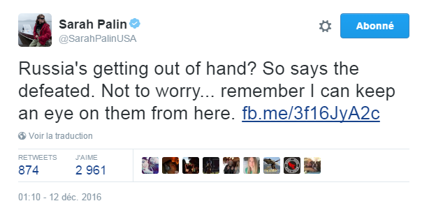 En 2008, alors qu’elle était candidate à la vice-présidence des Etats-Unis, Palin avait affirmé lors d’une interview qu’elle avait une bonne connaissance de la Russie parce que celle-ci était visible depuis l’Alaska, où elle réside. La déclaration avait été largement moquée et est restée célèbre.