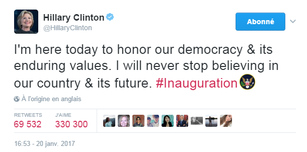 Alors que Barack Obama et Joe Biden quittaient Washington, Donald Trump et Mike Pence participaient à un déjeuner de gala au Capitole, en compagnie des membres du Congrès et d’autres invités. Bill et Hillary Clinton étaient notamment présents. Alors qu’il n’avait pas mentionné Hillary Clinton lors de son discours d’investiture, Donald Trump a pris la parole pour la remercier d’être venue. Il a même demandé aux personnes présentes dans la salle de se lever et de lui faire une standing ovation. « J’ai beaucoup de respect pour ces deux personnes », a-t-il déclaré au sujet de Bill et Hillary. Et dire qu’il y a peu de temps encore, il apparaissait en conférence de presse avec des femmes accusant Bill Clinton de viol et déclarait qu’Hillary Clinton devrait être en prison.