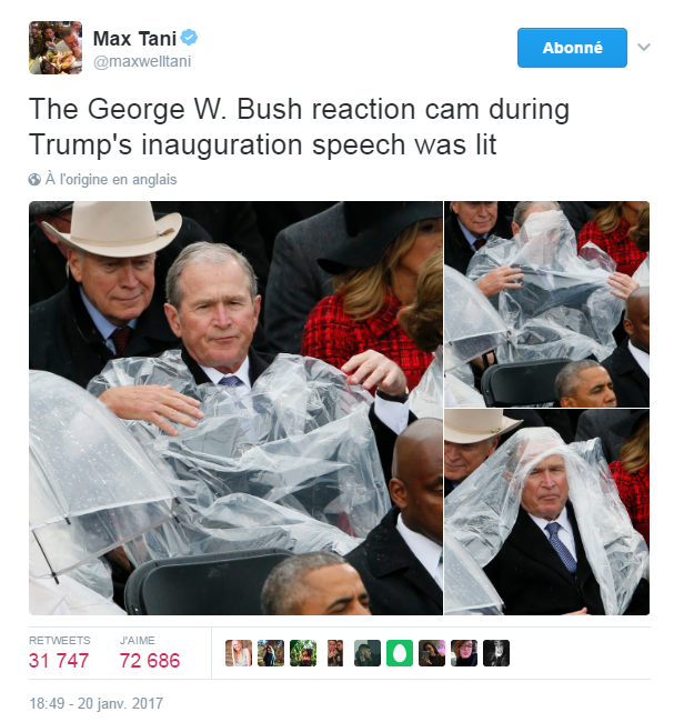 Cette photo de l’ex-président a été rapidement reprise par de nombreux internautes affirmant qu’il n’avait pas l’air de beaucoup apprécier le discours de Trump. Rappel: George W. Bush n’a jamais apporté son soutien à Trump et a affirmé avoir voté blanc lors de l’élection du 8 novembre dernier.