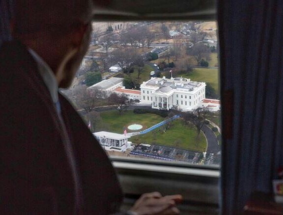Après la cérémonie d’investiture, un hélicoptère est venu chercher Barack et Michelle Obama au Capitole pour les emmener à la base militaire d’Andrews. Ils ont ensuite pris un avion pour Palm Springs, en Californie, où ils vont passer quelques jours de vacances. Pete Souza, le désormais ex-photographe de la Maison Blanche, a pris cette photo de Barack Obama au moment où son hélicoptère survolait le bâtiment lui ayant servi de domicile pendant huit ans.