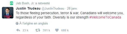 Enfin, le premier ministre canadien, Justin Trudeau, a répondu à Trump en annonçant que les réfugiés continueraient d’être les bienvenus au Canada. Son tweet a été partagé plus de 400,000 fois.