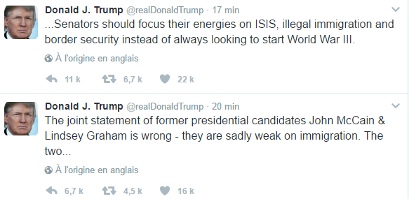 Parmi les opposants, on peut citer les sénateurs John McCain et Lindsey Graham, dont voici le communiqué commun.