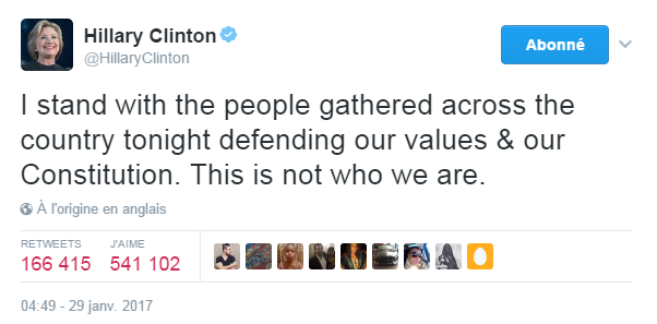 Hillary Clinton a également pris la parole (si on peut appeler cela comme ça) sur Twitter, pour apporter son soutien aux américains manifestant dans les aéroports.