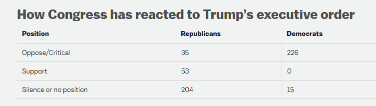 Les Républicains. Les membres du parti de Donald Trump ont mis du temps à réagir. Aucune condamnation au cours des vingt-quatre premières heures suivant la signature du décret. Ensuite, les langues se sont peu à peu déliées. Résultat? Le parti semble une fois de plus divisé. D’après les calculs de Vox, la majorité des élus républicains du Congrès n’a encore fait aucune déclaration à l’heure où nous écrivons ces lignes, 53 ont apporté leur soutien à Donald Trump et 35 ont critiqué son décret.