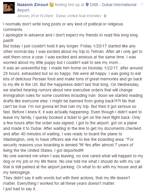 Plus incroyable encore, la Maison Blanche a rapidement confirmé que les détenteurs d’une green card étaient également concernés par l’interdiction d’accès au territoire. On parle là de personnes qui résident légalement aux Etats-Unis et y ont un permis de travail. Leur seul tort est d’avoir la mauvaise nationalité. Un citoyen iranien résidant légalement aux Etats-Unis et se trouvant à l’étranger au moment où le décret a été signé pouvait ainsi se retrouver dans l’impossibilité de rentrer chez lui ! C’est ce qui est arrivé à Nazanin Zinouri, une citoyenne iranienne qui réside légalement en Caroline du Sud depuis sept ans. Elle se trouvait en vacances en Iran au moment où le décret a été signé par Donald Trump. Elle y rendait visite à sa famille et ses amis. Lorsqu’elle a appris la signature du décret, elle a décidé d’écourter son séjour et d’acheter un billet d’avion à la hâte pour pouvoir rentrer chez elle. Mais il était déjà trop tard. À Dubaï, où elle était en transit, elle n’a pas pu embarquer à bord de l’avion qui devait l’amener à Washington. Elle a raconté son histoire sur sa page Facebook.